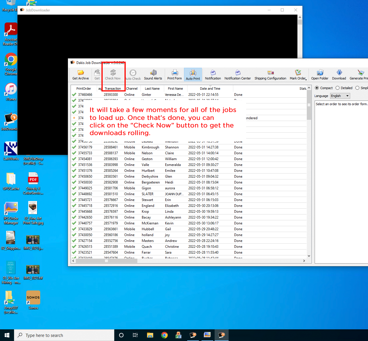 It will take a few moments to reload all the orders in the queue. Wait for that to happen and hit the check now button at the top of the application. The application checks for new downloads on it's own since we always have it "Auto Check" button on, but that could take another 10 minutes or so for it to hit its next cycle. "Check Now" will getting rolling right away.