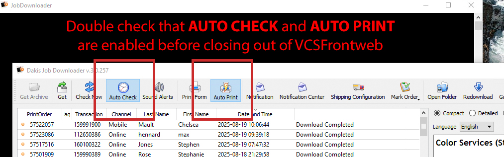 8. Lastly, make sure that in the Dakis Downloader that both AUTO CHECK and AUTO PRINT are enabled.