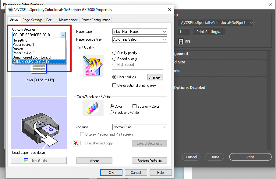 2) Now click on printer settings. That will open up the print settings for the Ricoh. Select the Custom Settings "Color Services 2018" and hit OK.