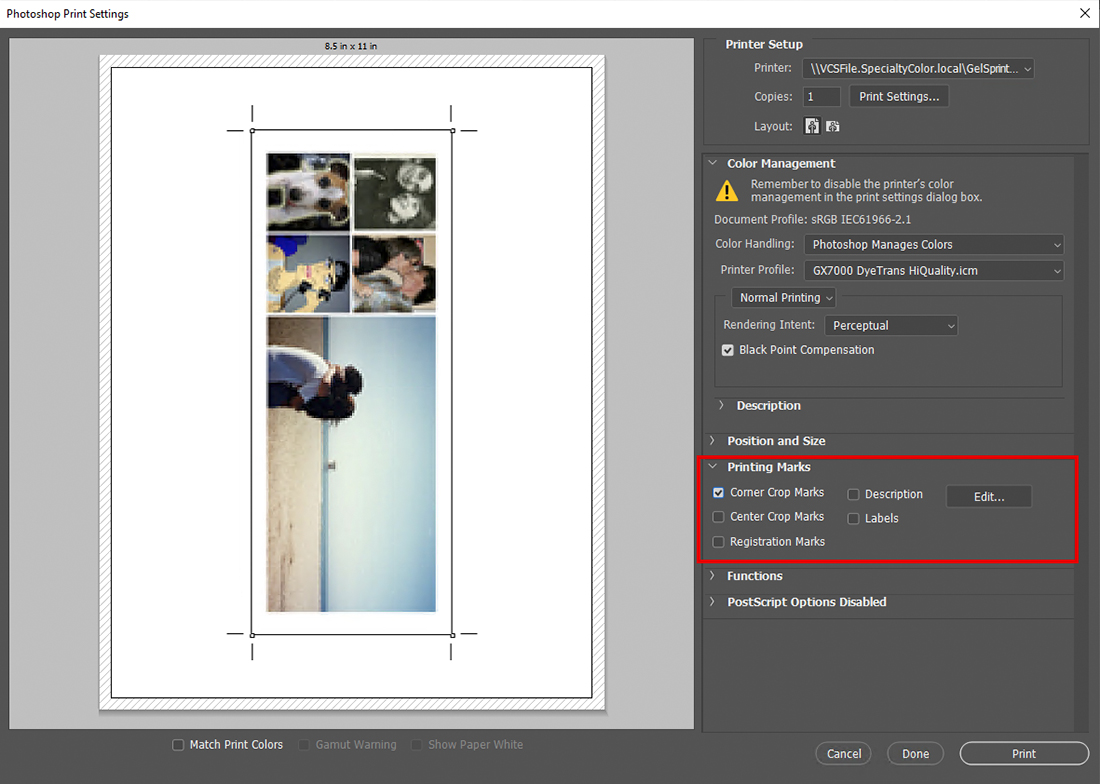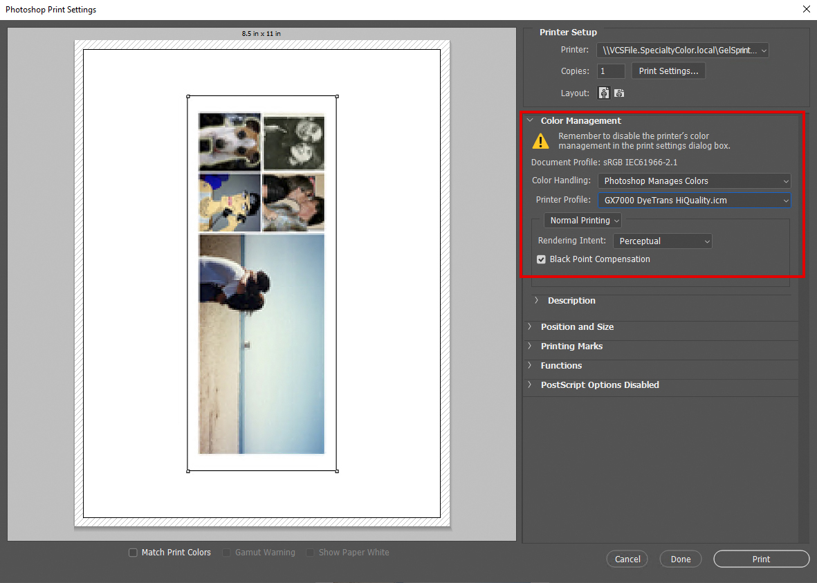 3) Now copy the color settings into the Photoshop Print Dialogue. See Below.